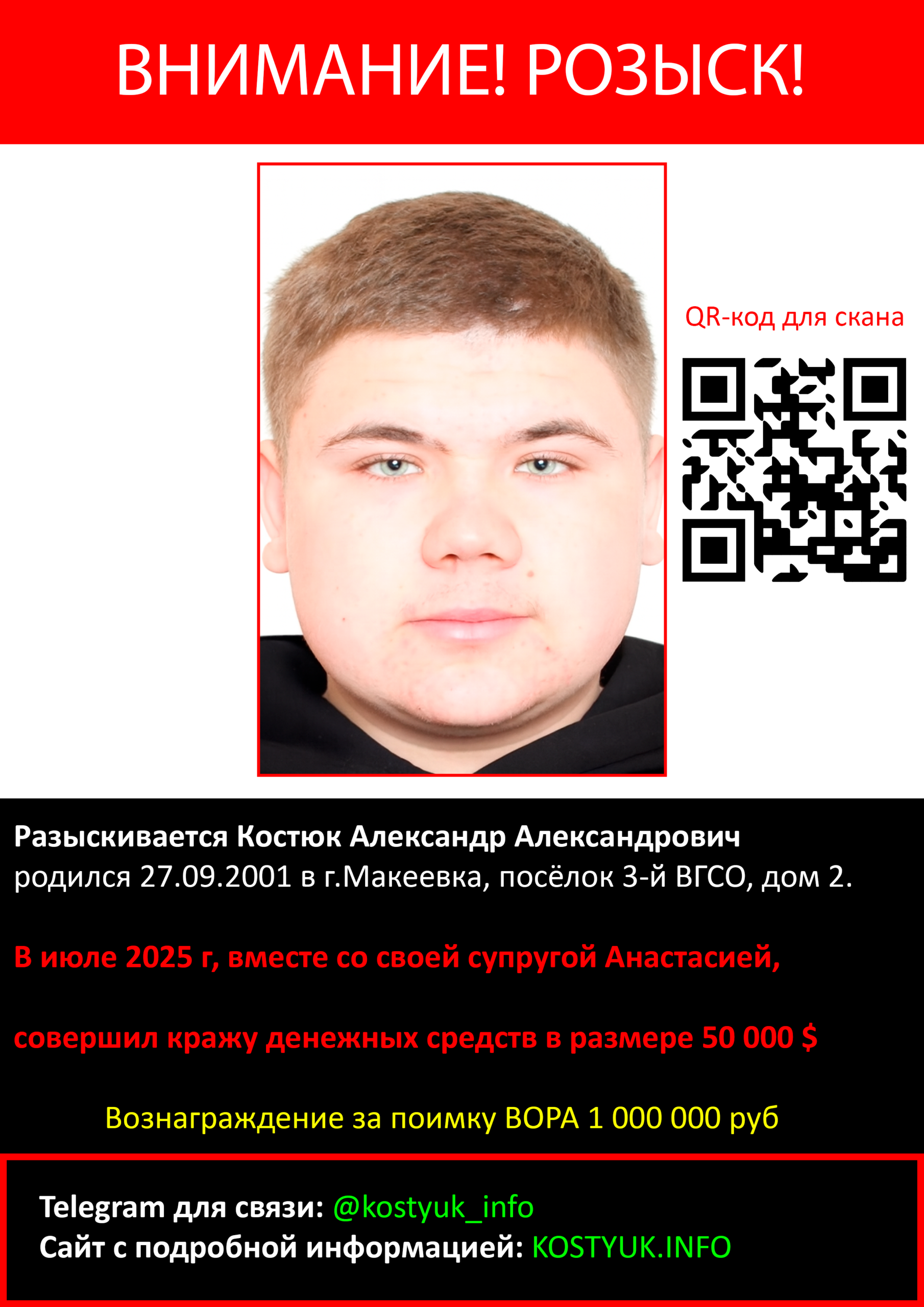 11 июля 2025 года вместе со своей супругой Анастасией Костюк, совершил кражу денежных средств в размере 50 000 $, воспользовавшись наработанным доверием у людей.